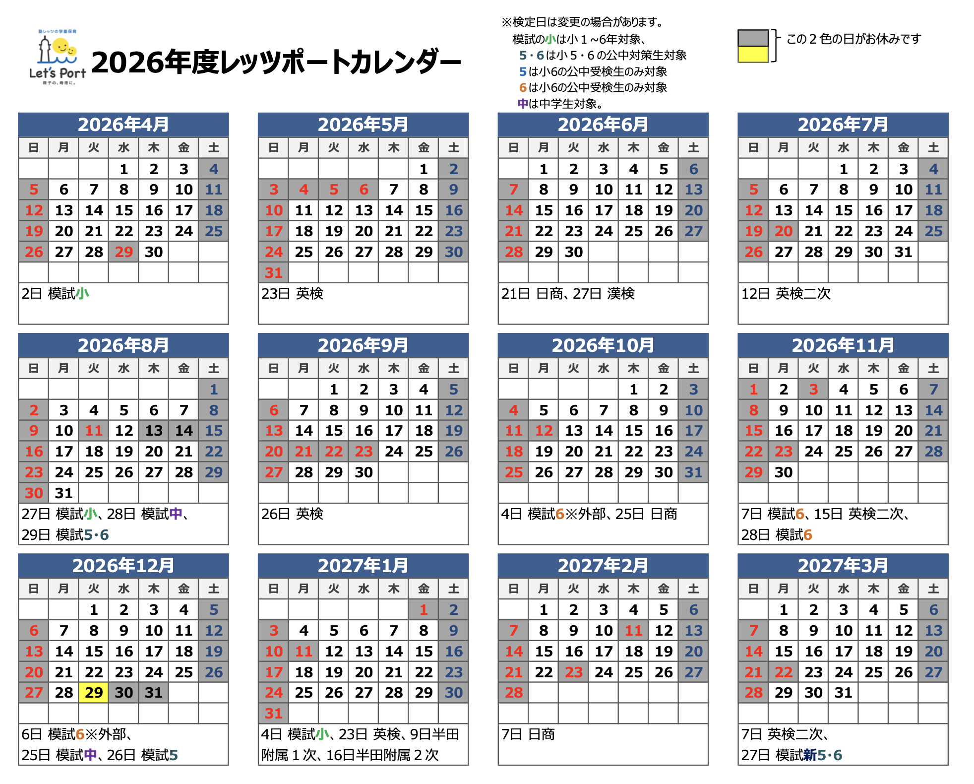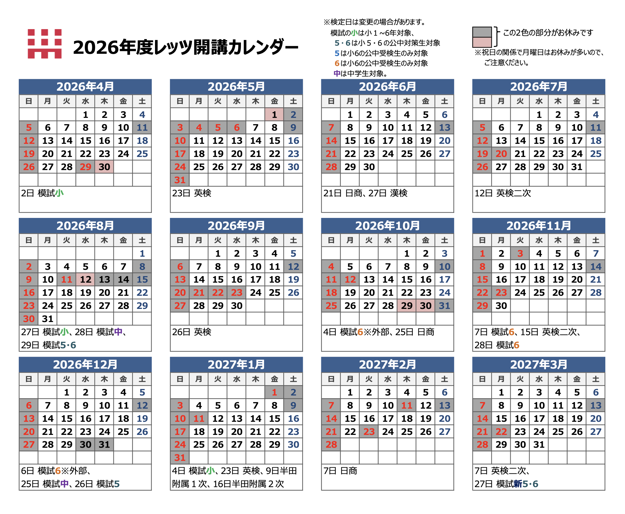 検定や模試の日程は変更の可能性がありますこと、ご了承ください。